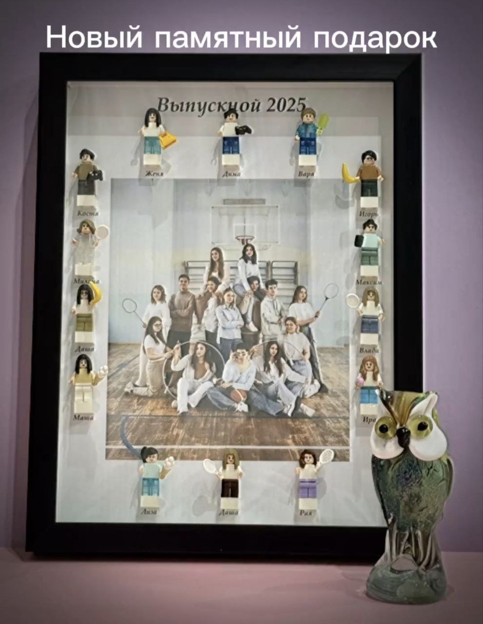 Необычный памятный подарок. Особенно идеален для выпускников. Фото класса, а вокруг лего-фигурки учеников. Заказать можно на сайте brick-pic.ru